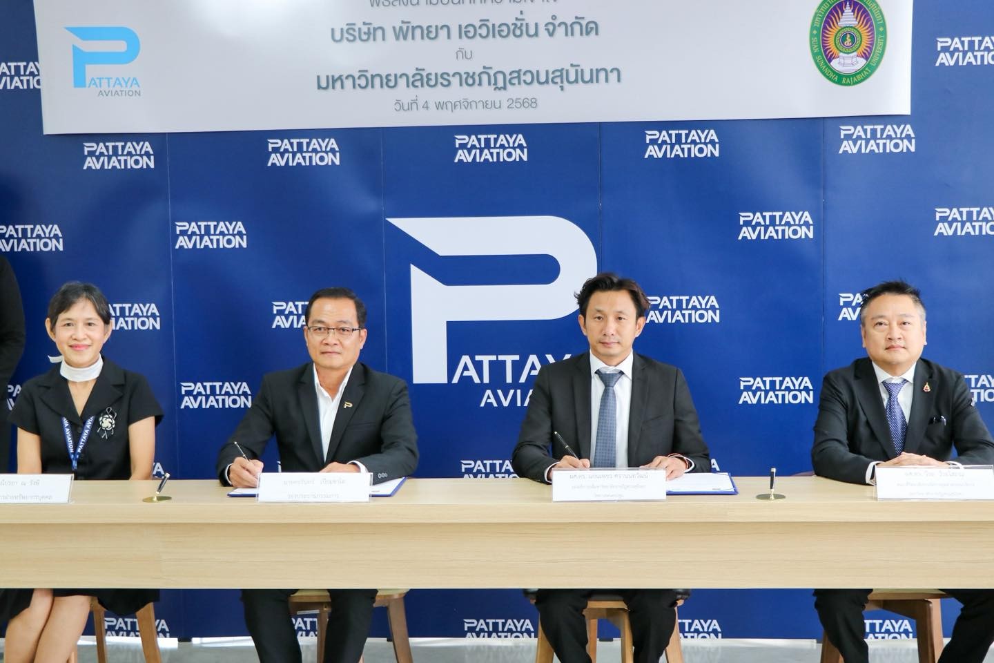 วันอังคารที่ 4 พฤศจิกายน พ.ศ. 2568 มหาวิทยาลัยราชภัฏสวนสุนันทา นำโดย ผู้ช่วยศาสตราจารย์ ดร.แก่นเพชร ศรานนทวัฒน์ รองอธิการบดีวิทยาเขตนครปฐม พร้อมด้วย ผู้ช่วยศาสตราจารย์ ดร.วีระ วีระโสภณ คณบดีวิทยาลัยการจัดการอุตสาหกรรมบริการ เป็นผู้แทนอธิการบดี เข้าร่วมพิธีลงนามบันทึกความเข้าใจ (MOU) ระหว่างมหาวิทยาลัยราชภัฏสวนสุนันทา กับ บริษัท พัทยา เอวิเอชั่น จำกัด นำโดย นายคชรินทร์ เปี่ยมชาโต ณ บริษัท พัทยา เอวิเอชั่น จำกัด จังหวัดชลบุรี