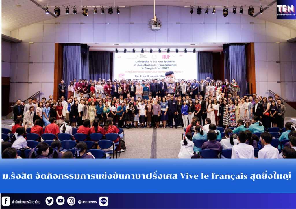 สาขาวิชาภาษาฝรั่งเศส วิทยาลัยศิลปศาสตร์ มหาวิทยาลัยรังสิต รังสิต ร่วมกับ สมาคมครูภาษาฝรั่งเศสแห่งประเทศไทยฯ โดยการสนับสนุนของสถานเอกอัครราชทูตฝรั่งเศสประจำประเทศไทย องค์กรความร่วมมือระหว่างมหาวิทยาลัยในกลุ่มประเทศสมาชิกผู้พูดภาษาฝรั่งเศส (AUF) องค์กรความร่วมมือนานาชาติของกลุ่มประเทศผู้พูดภาษาฝรั่งเศส ประจำภูมิภาคเอเชียแปซิฟิก (CREFAP-OIF) จัดกิจกรรมการแข่งขันภาษาฝรั่งเศส Vive le français ประจําปี 2568 ภายในงานพบกับกิจกรรมการแข่งขันจำนวน 5 ประเภท ได้แก่ การแข่งขัน La France en défilé การแข่งขันวาดภาพ การแข่งขันพูดสุนทรพจน์ภาษาฝรั่งเศส การแข่งขัน Savoir communiquer en français และการแข่งขันตอบปัญหาความรู้ทั่วไปเกี่ยวกับภาษาและวัฒนธรรมฝรั่งเศส นอกจากนี้ ยังมีการออกร้านฝรั่งเศส บอร์ดนิทรรศการ และเกมความรู้ด้านภาษาฝรั่งเศสอื่นๆ อีกมากมาย ณ ห้องประชุม 1-301 อาคารอาทิตย์ อุไรรัตน์ (อาคาร 1) มหาวิทยาลัยรังสิต #สำนักข่าวการศึกษาไทย